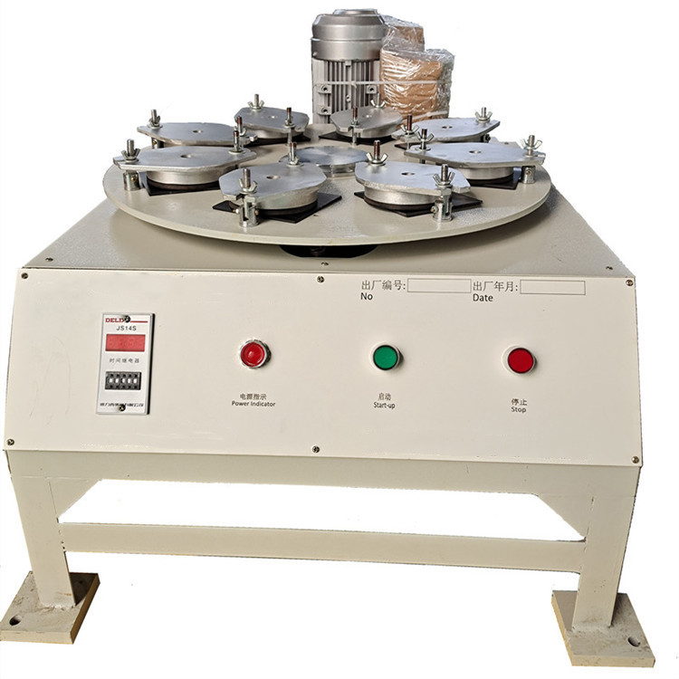 該儀器由機(jī)體、傳動(dòng)機(jī)構(gòu)、支承轉(zhuǎn)盤、八個(gè)帶橡膠密封的金屬夾具盒和電控裝置組成。電機(jī)通過傳動(dòng)機(jī)構(gòu),支承盤以每分鐘300轉(zhuǎn)速運(yùn)轉(zhuǎn),隨之產(chǎn)生22.5mm的偏心距(e),因此,使每塊試樣做直徑為45mm的圓周運(yùn)動(dòng),從而使磨料在試樣釉面上研磨,電控裝置將預(yù)先設(shè)定的轉(zhuǎn)數(shù)進(jìn)行控制,當(dāng)達(dá)到預(yù)定轉(zhuǎn)數(shù)時(shí),可自動(dòng)停機(jī)。該設(shè)備具有結(jié)構(gòu)新穎、運(yùn)轉(zhuǎn)平穩(wěn)、噪音低、操作簡便,可同時(shí)作8個(gè)和少于8個(gè)樣品的試驗(yàn),由于配置有數(shù)顯時(shí)間繼電器,操作者只需接通電源,不需任何監(jiān)視,它將按照所設(shè)定 的時(shí)間(轉(zhuǎn)數(shù))自動(dòng)完成。